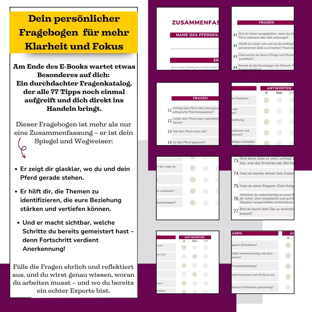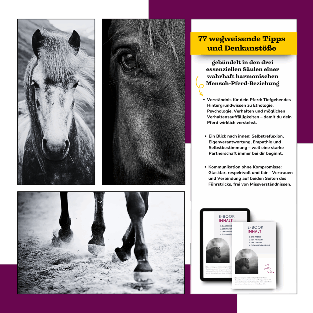 Dieses E-Book ist nicht einfach nur eine Sammlung von Tipps – es ist dein Werkzeugkasten, um deine Beziehung zu deinem Pferd auf ein völlig neues Level zu heben. Hier ein kleiner Vorgeschmack auf das, was dich erwartet: